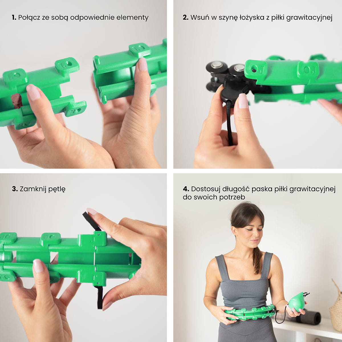 Pętlę otwieramy za pomocą klipsów na magnes. Następnie aby połączyć kolejne elementy należy wsunąć jeden element w drugi tak aby wypustki trafiły w odpowiednie otwory. Przy redukcji elementów, należy jedną ręką chwycić za odpowiedni element i ścisnąć w taki sposób aby wysunąć wypustki z otworów. Następnie należy wsunąć do pętli szynę z piłką grawitacyjną, zamknąć klipsy na magnes, dostosować długość paska i gotowe. Dodatkowo dzięki kompaktowym rozmiarom jest łatwy w przenoszeniu, możesz zabrać ten produkt wszędzie ze sobą.