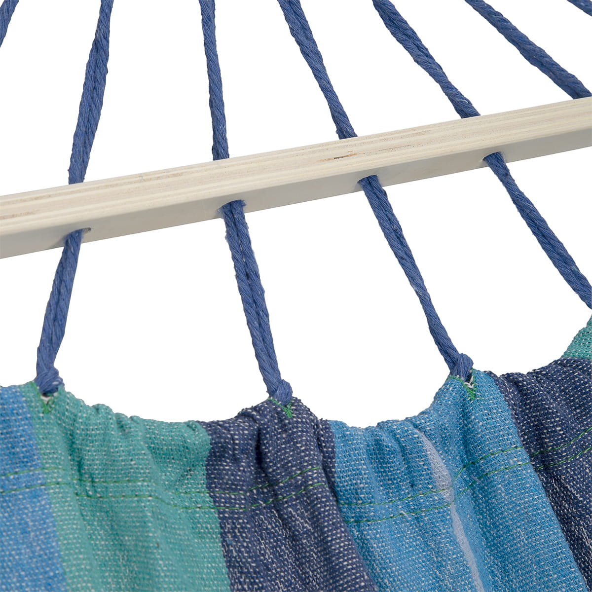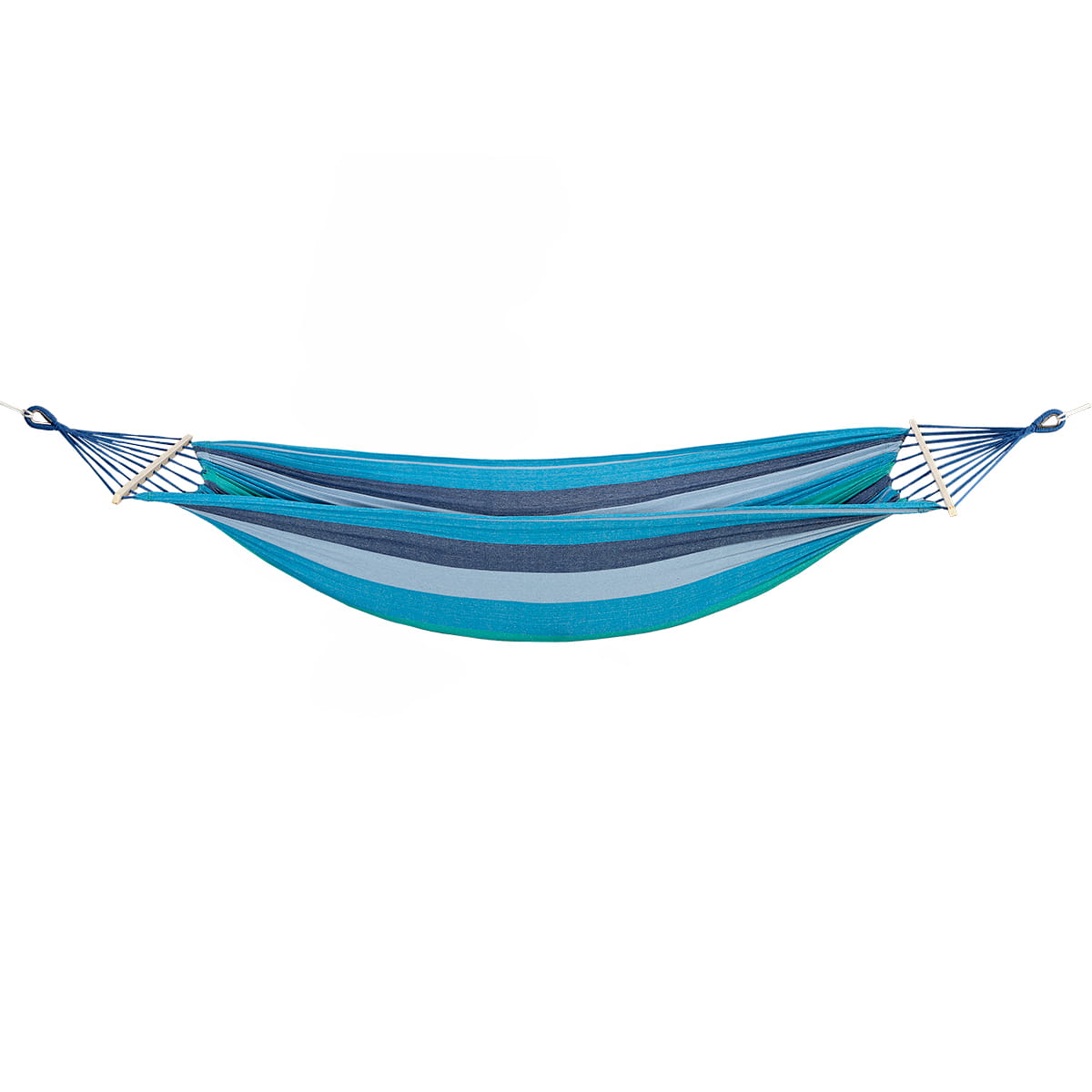 To hamak, przeznaczony do zawieszenia np. między dwoma drzewami. Łatwy w montażu, wszystkie niezbędne przybory, znajdują się w zestawie. Już po kilku chwilach, będziemy mogli oddać się, błogiemu odpoczynkowi. Drewniana belka o długości 70 cm, umieszczona w hamaku jako wzmocnienie sprawia, że materiał nie będzie się naciągał, przez co jego sprężystość będzie cały czas na takim samym, wysokim poziomie. Dzięki temu, będziemy odczuwali komfort użytkowania, przez wiele sezonów. Hamak idealnie dopasuje się naszego ciała, a szerokość aż 150 cm gwarantuje każdemu, znalezienie wygodnej pozycji. Materiał hamaka, to poliester oraz przyjemna, gęsto pleciona bawełna. Takie połączenie, daje bardzo wysoką wytrzymałość oraz odporność, na jakiekolwiek odkształcenie.